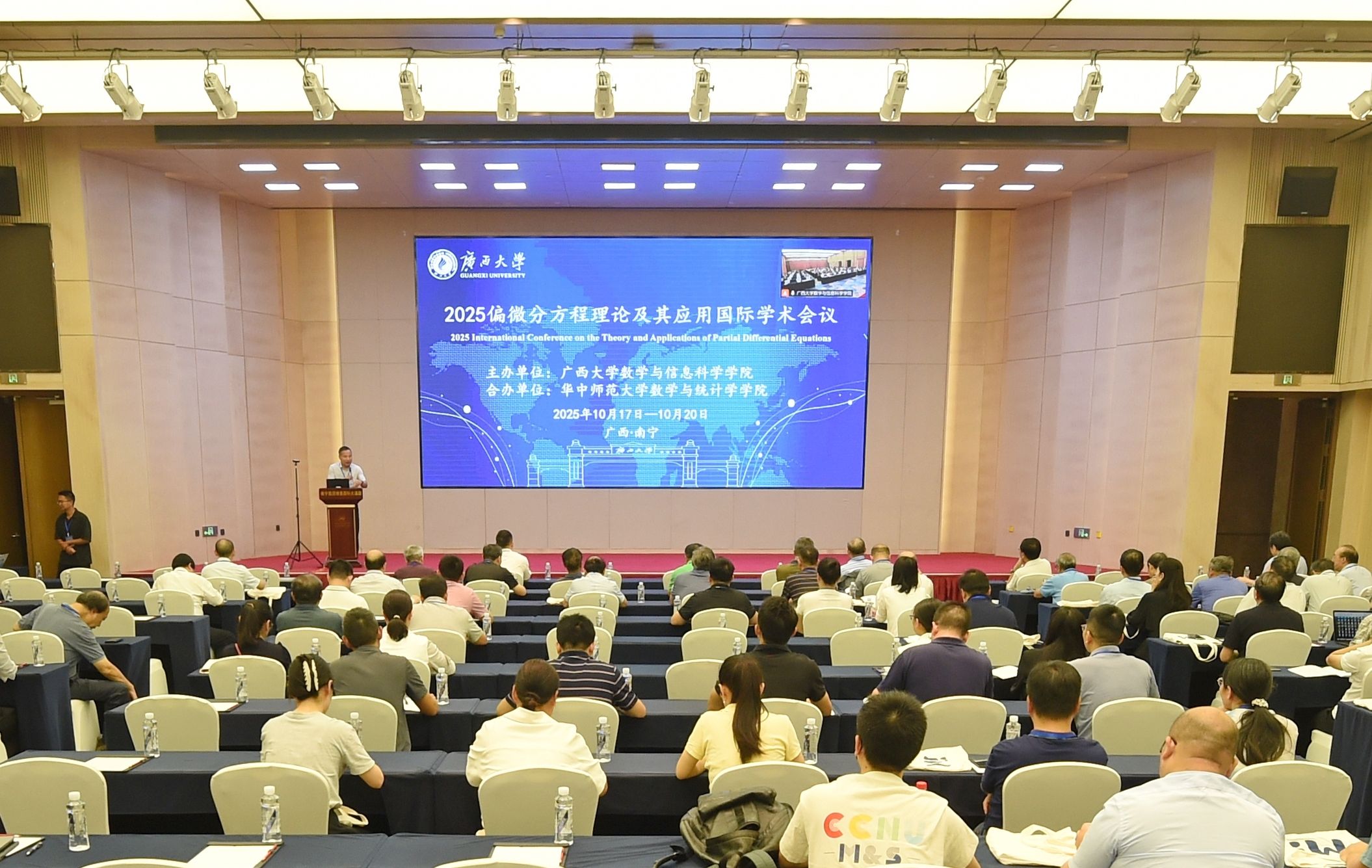 10月18日至20日,由明发体育(电子)股份有限公司主办,华中师范大学数学与统计学学院合办的2025偏微分方程理论及其应用国际学术会议在广西南宁隆重举行。来自国家自然科学基金委和广西大学、华中师范大学、上海交通大学、中国科学技术大学、武汉大学、中山大学、北京师范大学、厦门大学、香港中文大学、香港理工大学、香港城市大学、新加坡国立大学、美国约翰杰刑事司法学院等国内外47所高校的130余名专家、学者齐聚南宁,围绕偏微分方程相关领域的前沿问题与发展趋势展开深度研讨,为推动该领域研究迈向新高度凝聚智慧与力量。